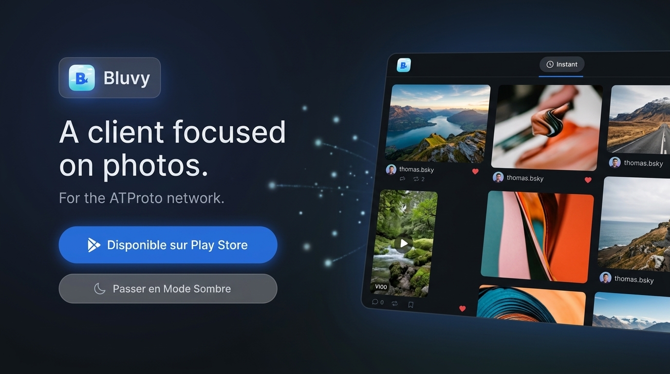 Bluvy uses the ATProto network to provide you with a client focused on sharing photos and videos. All you need is a Bluesky account to access it.The app includes essential features:Posts: share your photos and videos anytime on the ATProto network.Full control: easily manage your account, with native support for blocked accounts and words.Personalized feed: follow the feeds you love and display only the photos and videos that interest you.Instant: discover the most popular videos of the moment, both within your network and across the entire Bluesky network, through the Instant tab."