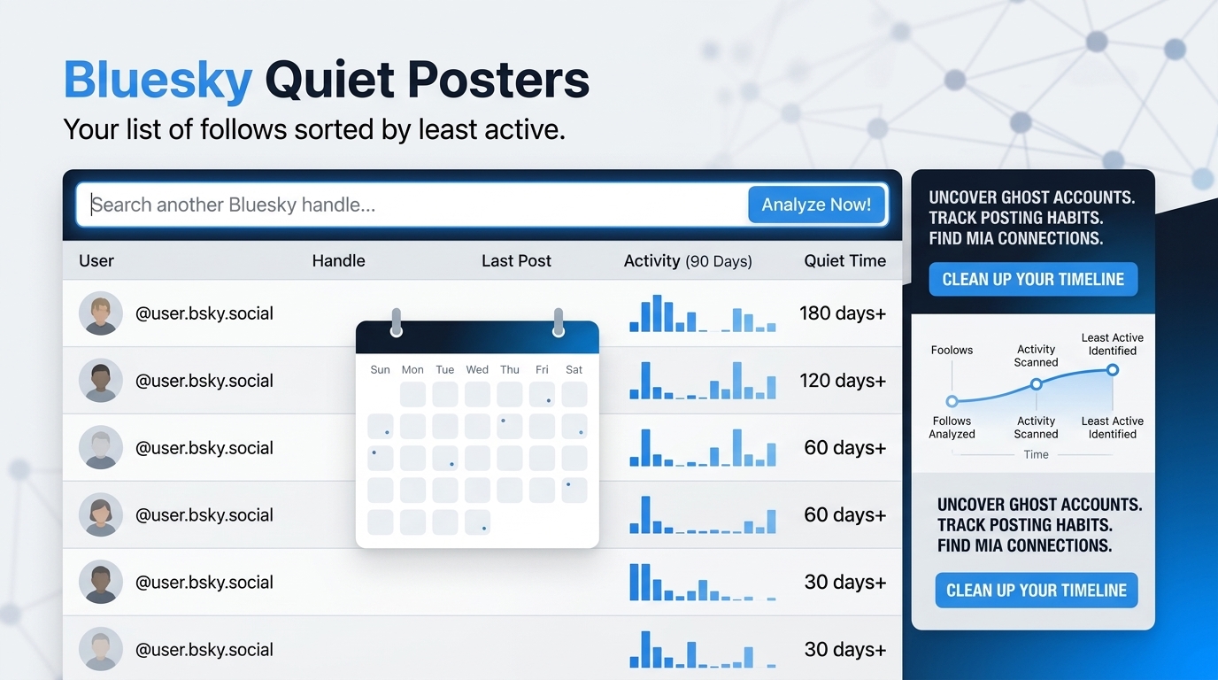 Bluesky Quiet Posters is your go-to tool for spotting the quietest accounts in your feed! It helps you uncover which connections are basically ghosting your timeline by tracking their posting habits. The result? A handy ranked list showing who’s been MIA in your feed!
