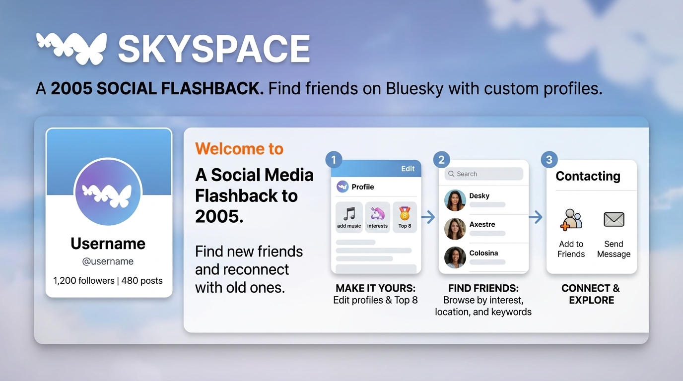 SkySpace is a work-in-progress social media flashback to 2005, when the internet was good and part of it belonged to you. It's also an easy way to find people and make new friends on Bluesky.
